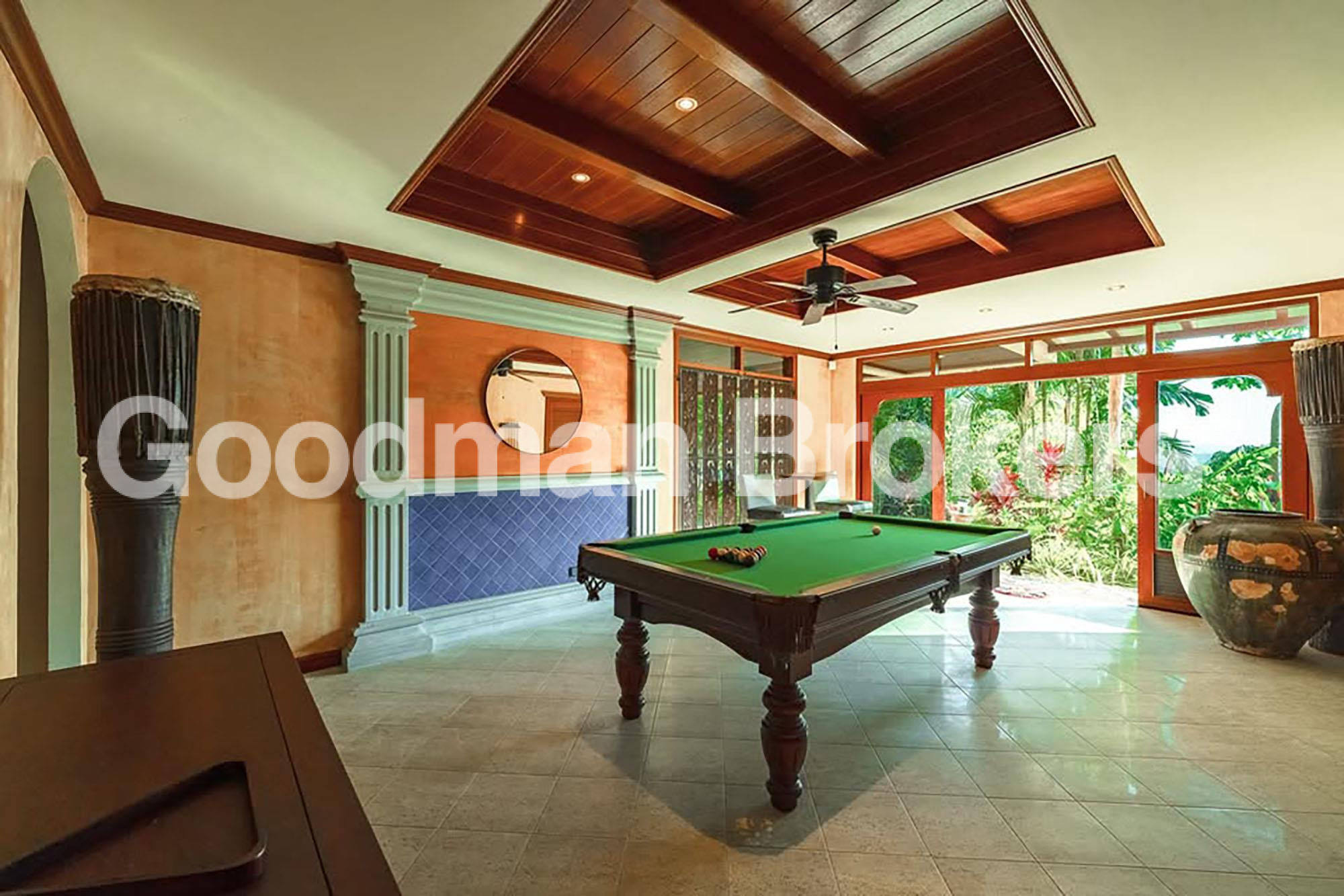 别墅设有7间卧室,6间浴室,2间客用卫生间和2间设备齐全的厨房。其他设施包括台球室,大型私人游泳池和专为户外娱乐而设计的烧烤露台。