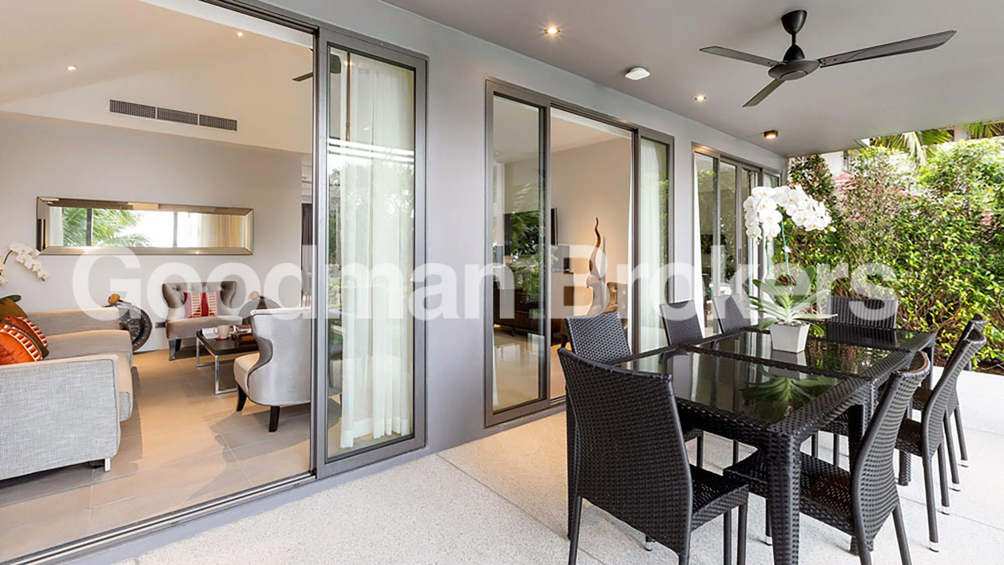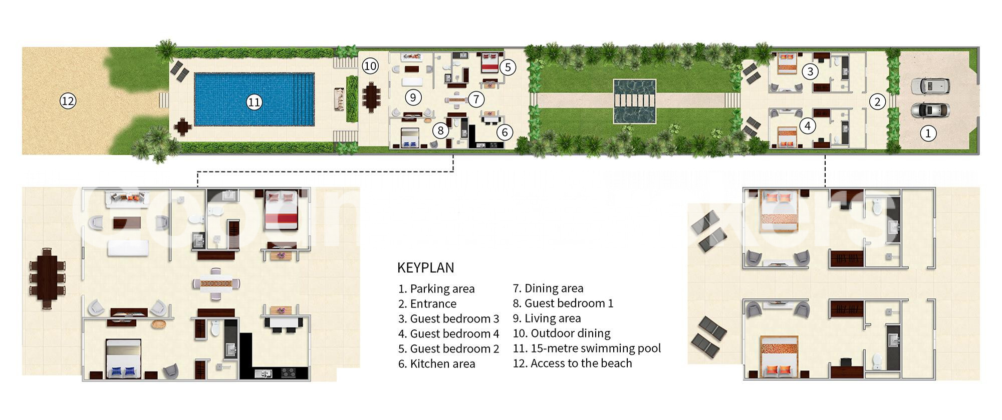 别墅设计注重开阔空间、自然采光与实用功能。四间宽敞卧室分布于两座亭阁,由锦鲤池庭院相连。客厅通向海景露台,配备户外休闲区与用餐区。主亭阁后部设有配备齐全的现代化厨房及带空调的室内餐厅。