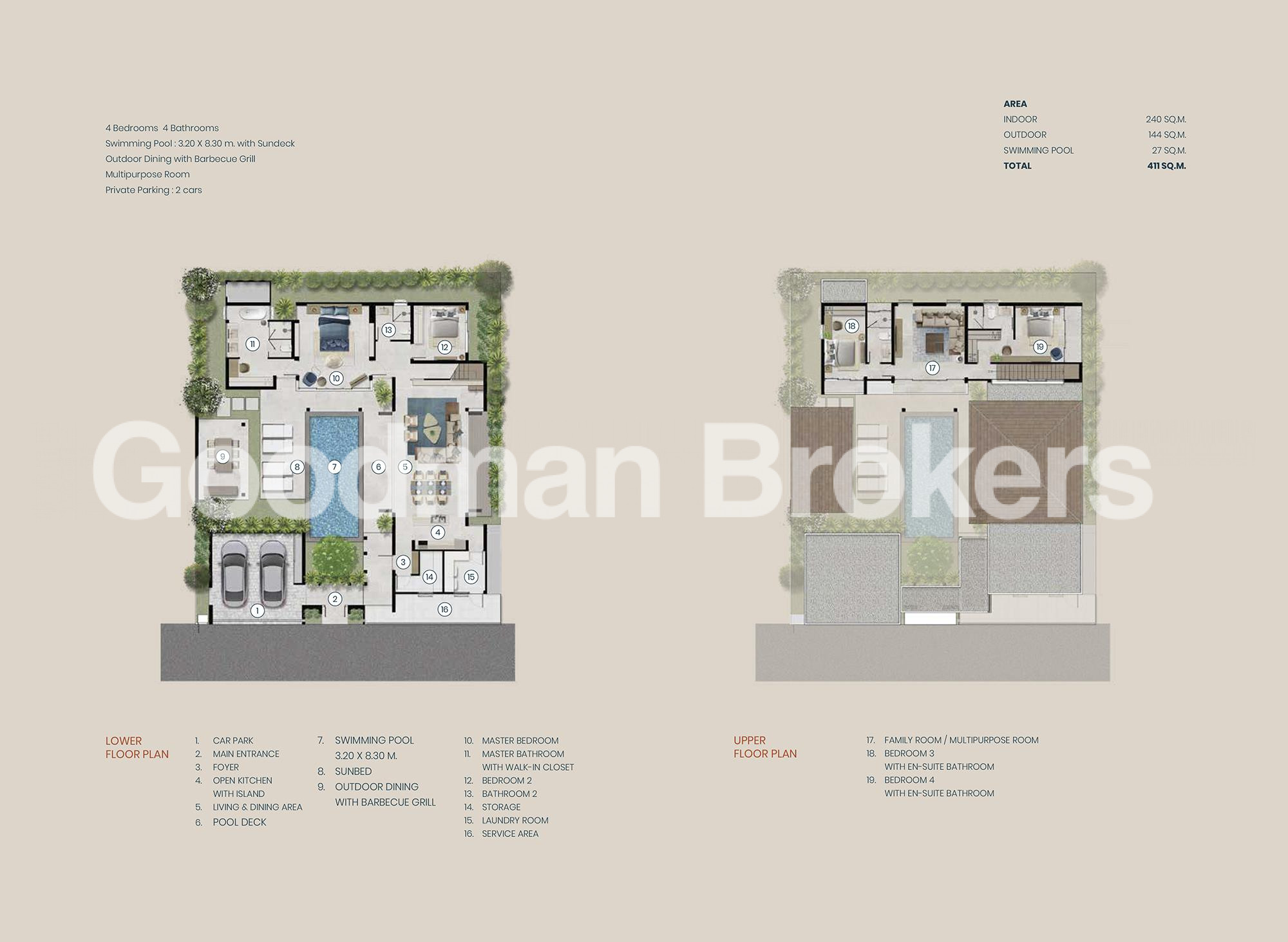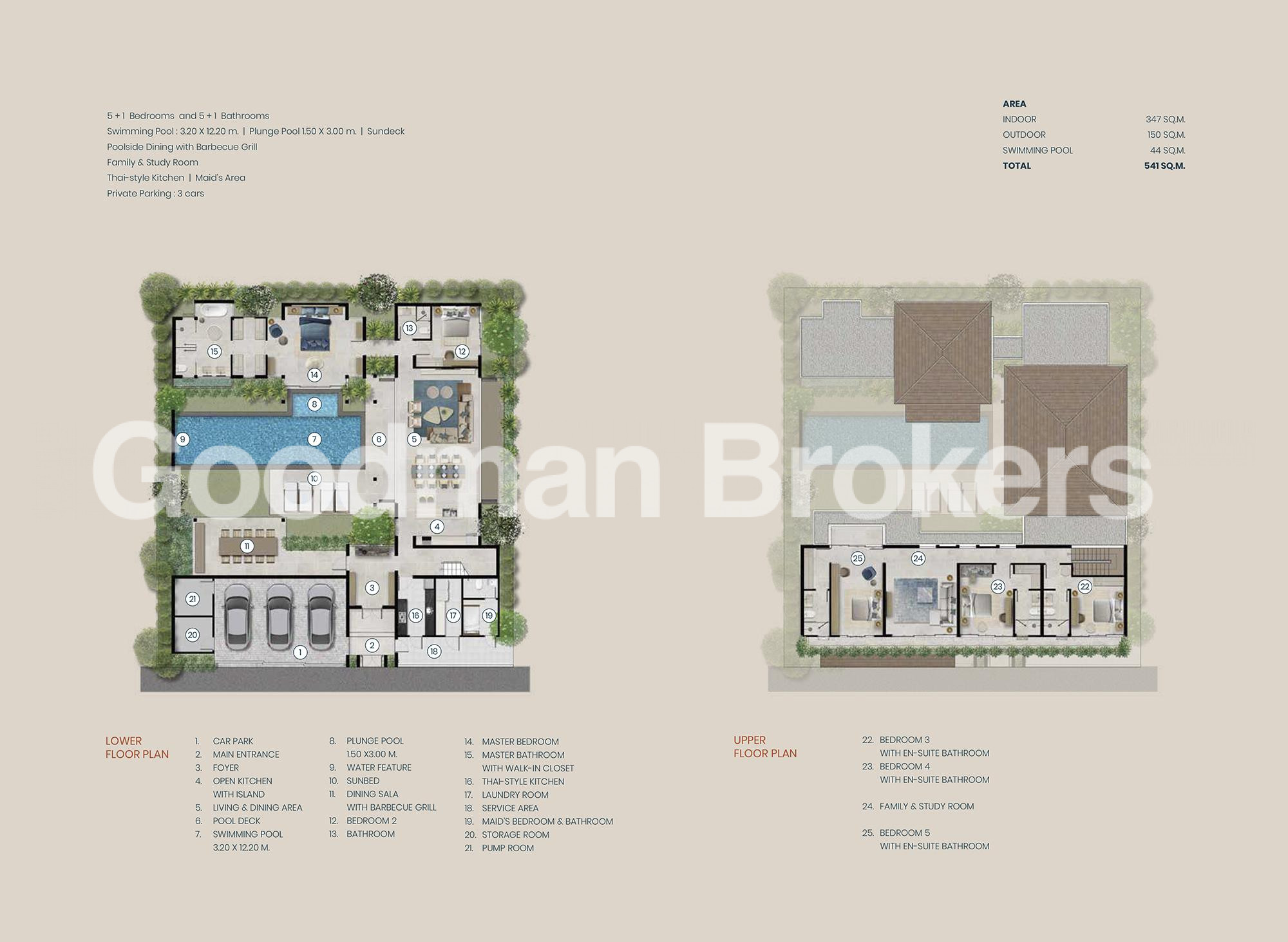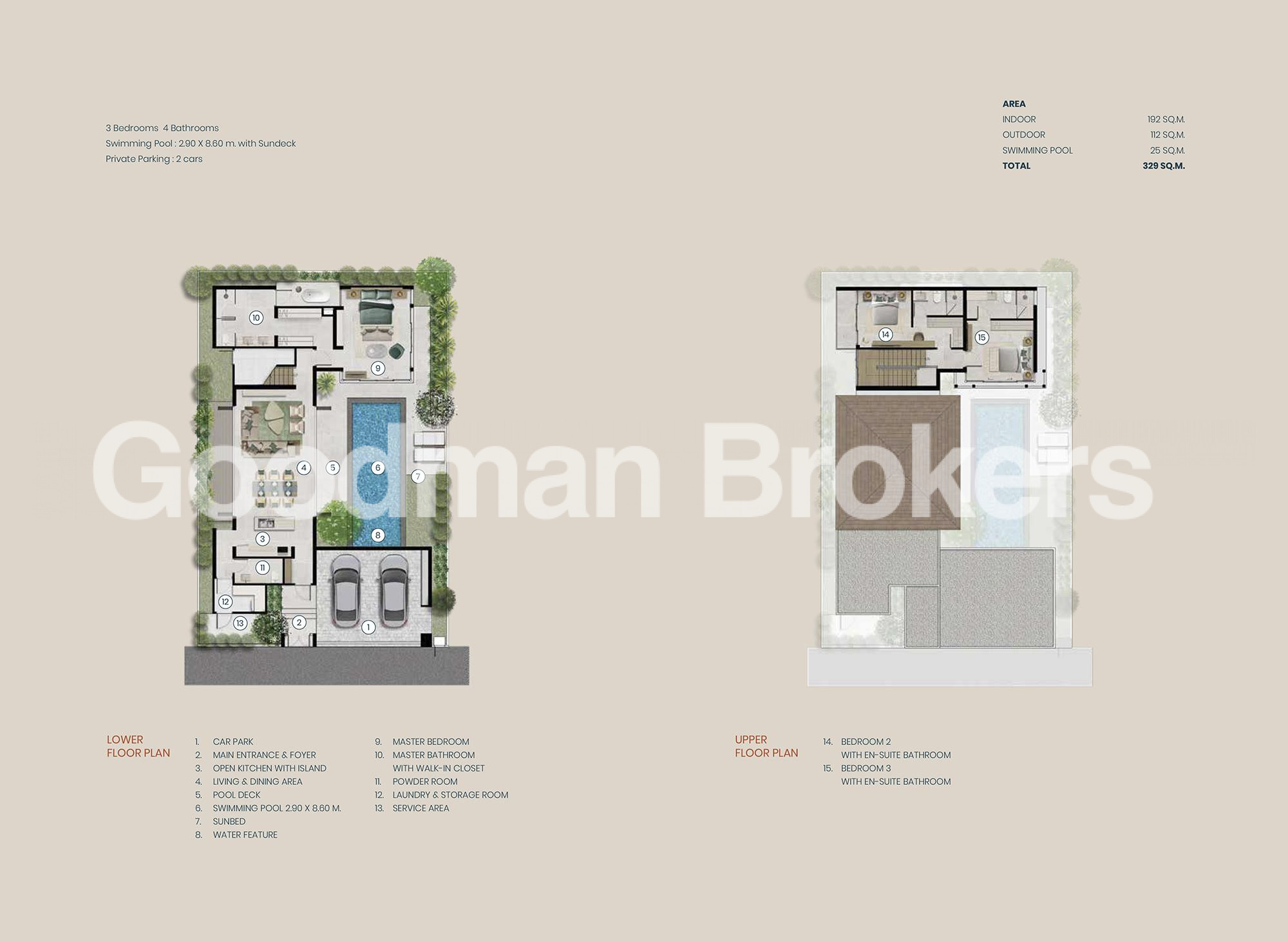 本项目提供3至5卧私人泳池别墅,室内面积202至518平方米,土地面积406至900平方米。每栋别墅均采用开放式生活空间,配备挑高天花板,精选优质建材及私属景观花园。