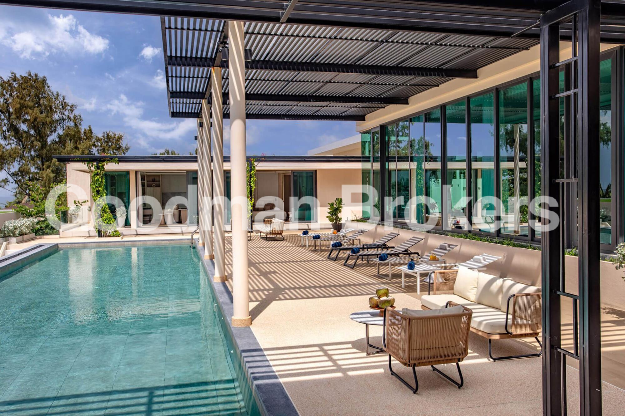 Two infinity pools overlook the Andaman Sea and form the centerpiece of the outdoor experience. Generous sun terraces and multiple seating areas provide ideal settings for relaxation, informal meetings, or quiet leisure throughout the day. Large panoramic windows connect indoor and outdoor environments, filling the main living, dining, and kitchen spaces with natural light and uninterrupted sea views.
