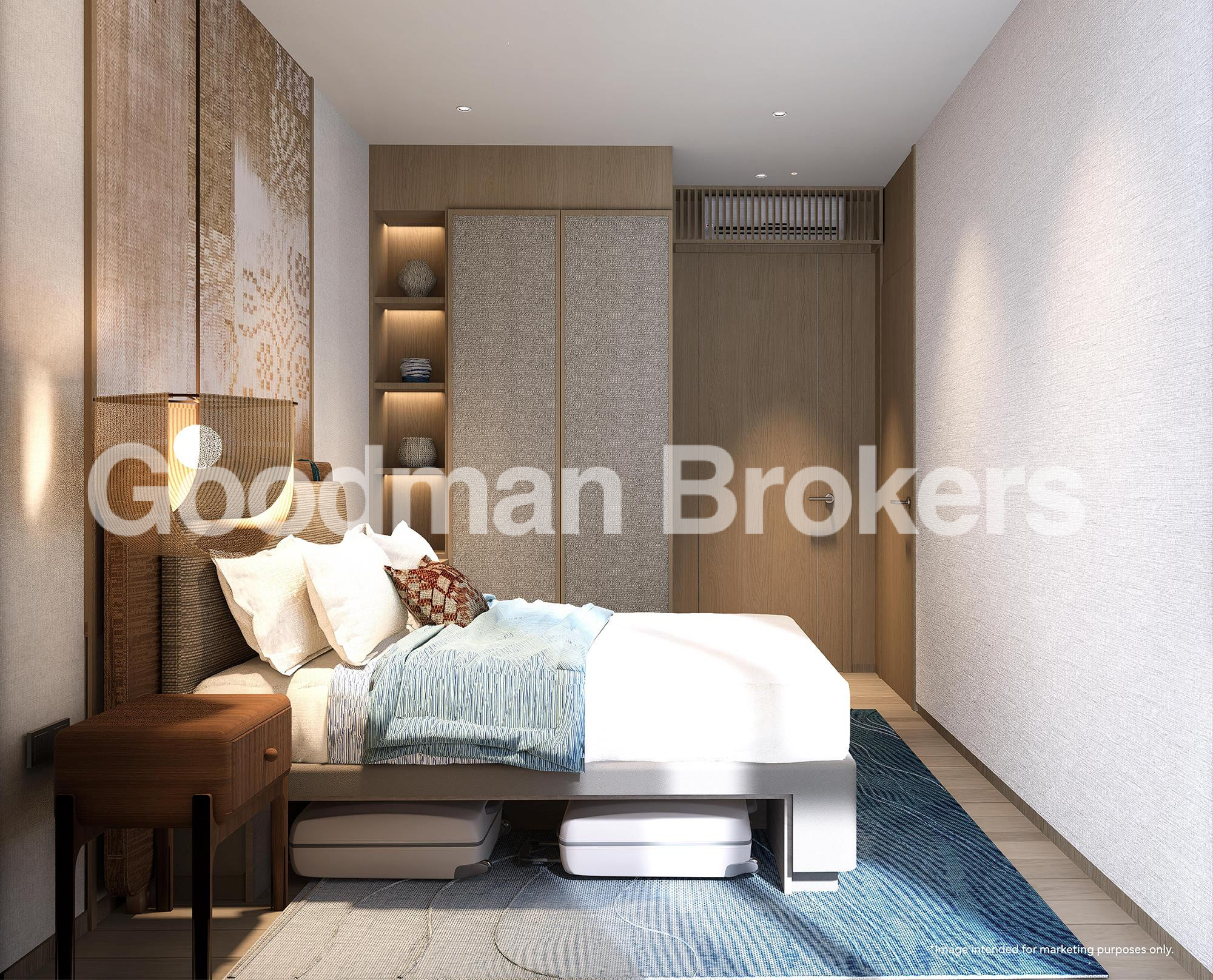 This fully furnished residence offers 83 to 86 sq.m., of well designed living space, finished in a modern tropical style that highlights natural light, functional layout planning and refined interior detailing. The living area features full height glass windows that open directly to a spacious balcony measuring 1.5 meters in depth and 3 meters in width, creating a smooth indoor outdoor flow ideal for relaxation.