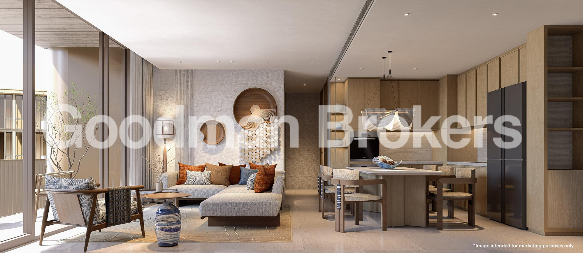 The development also offers the option to combine one and two bedroom units into a spacious 3 bedroom residence totaling 129 sq.m., ideal for families seeking additional space and flexibility.