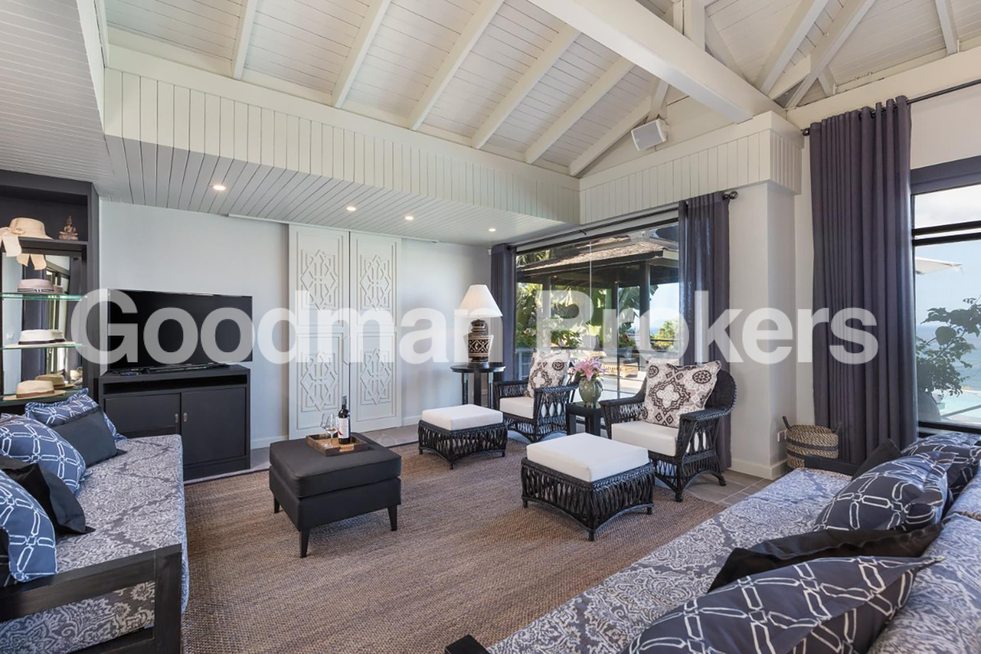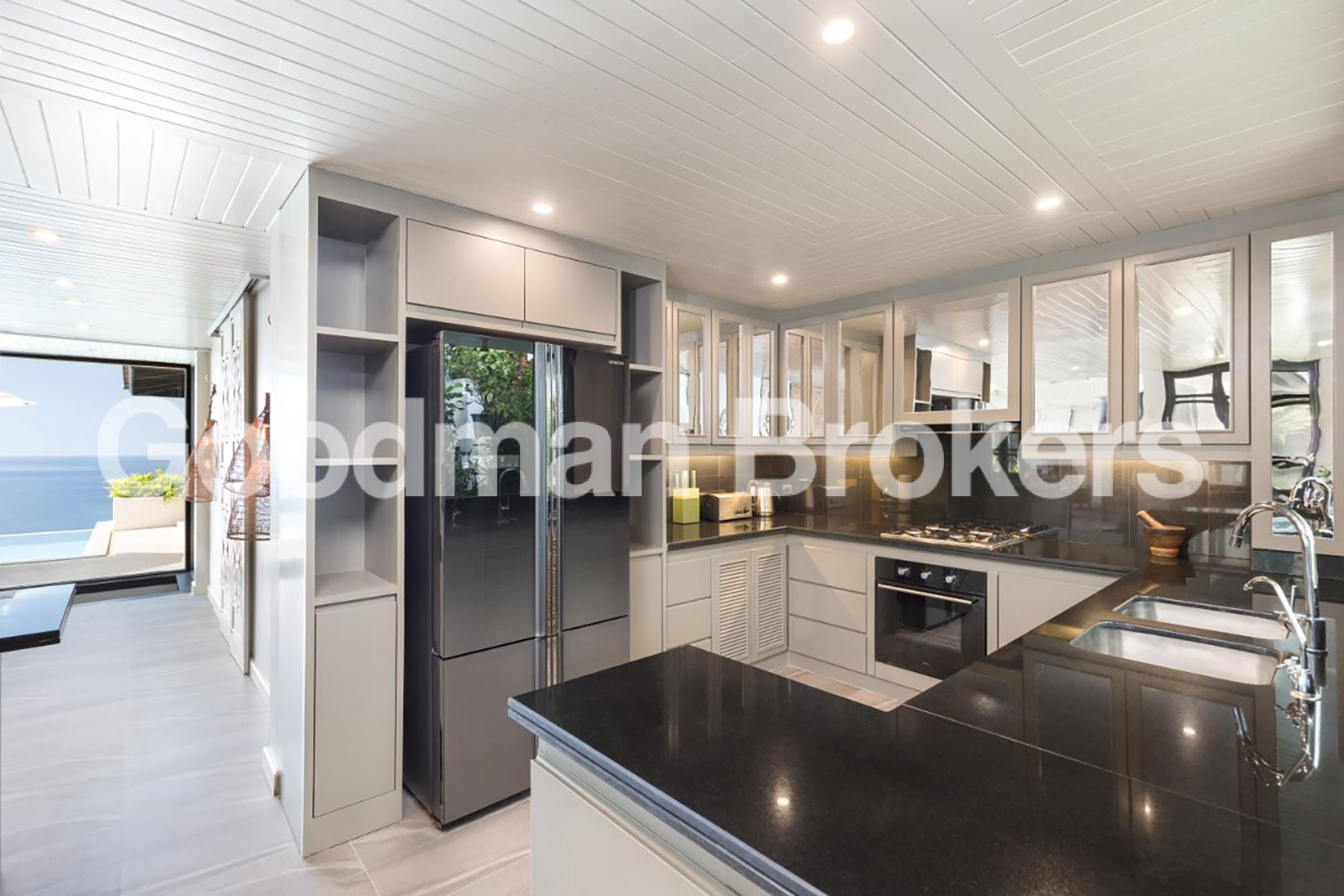 The upper level serves as the principal living floor. Cathedral ceilings enhance spatial volume and natural light. Formal and informal living areas integrate with dedicated dining space and a fully equipped Western kitchen. Floor to ceiling openings connect directly to the sea facing terrace and the private 10m x 5m swimming pool, positioned to capture uninterrupted coastal views. Two master suites are located on this level, each benefiting from elevated outlooks and direct terrace access.