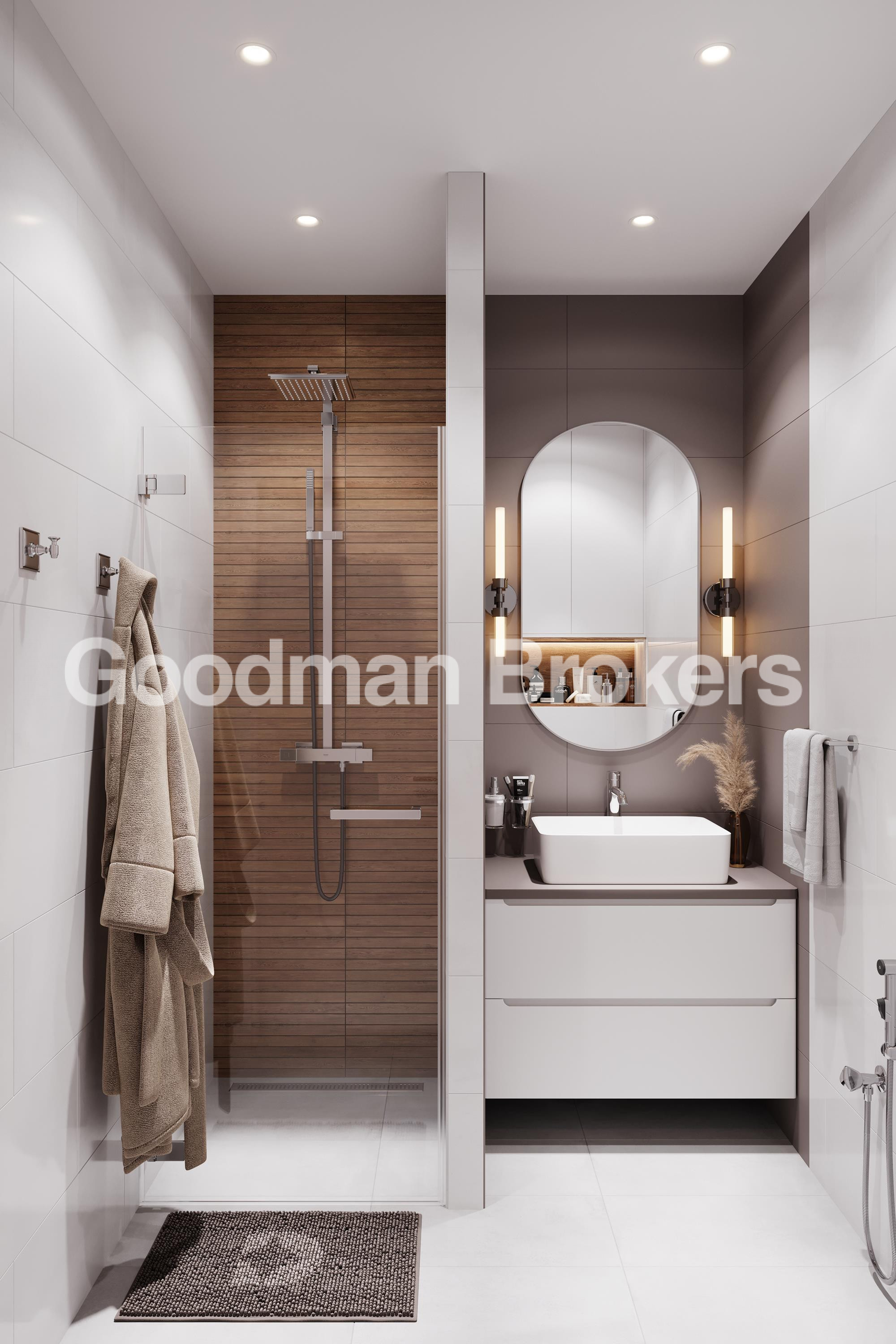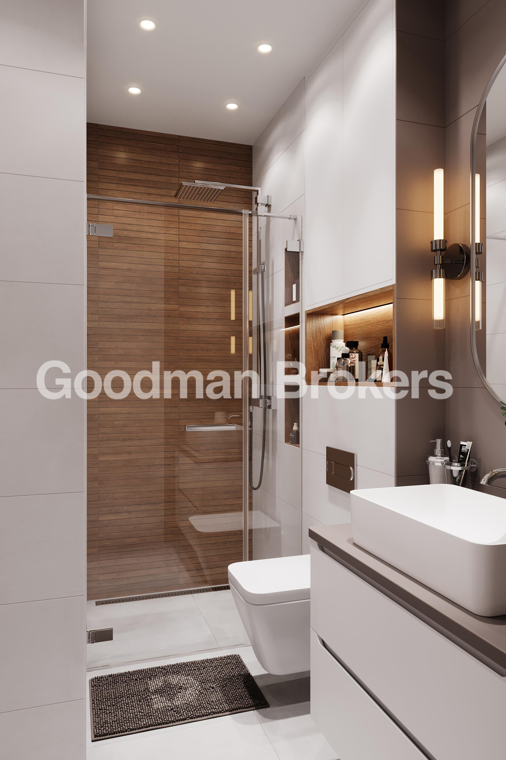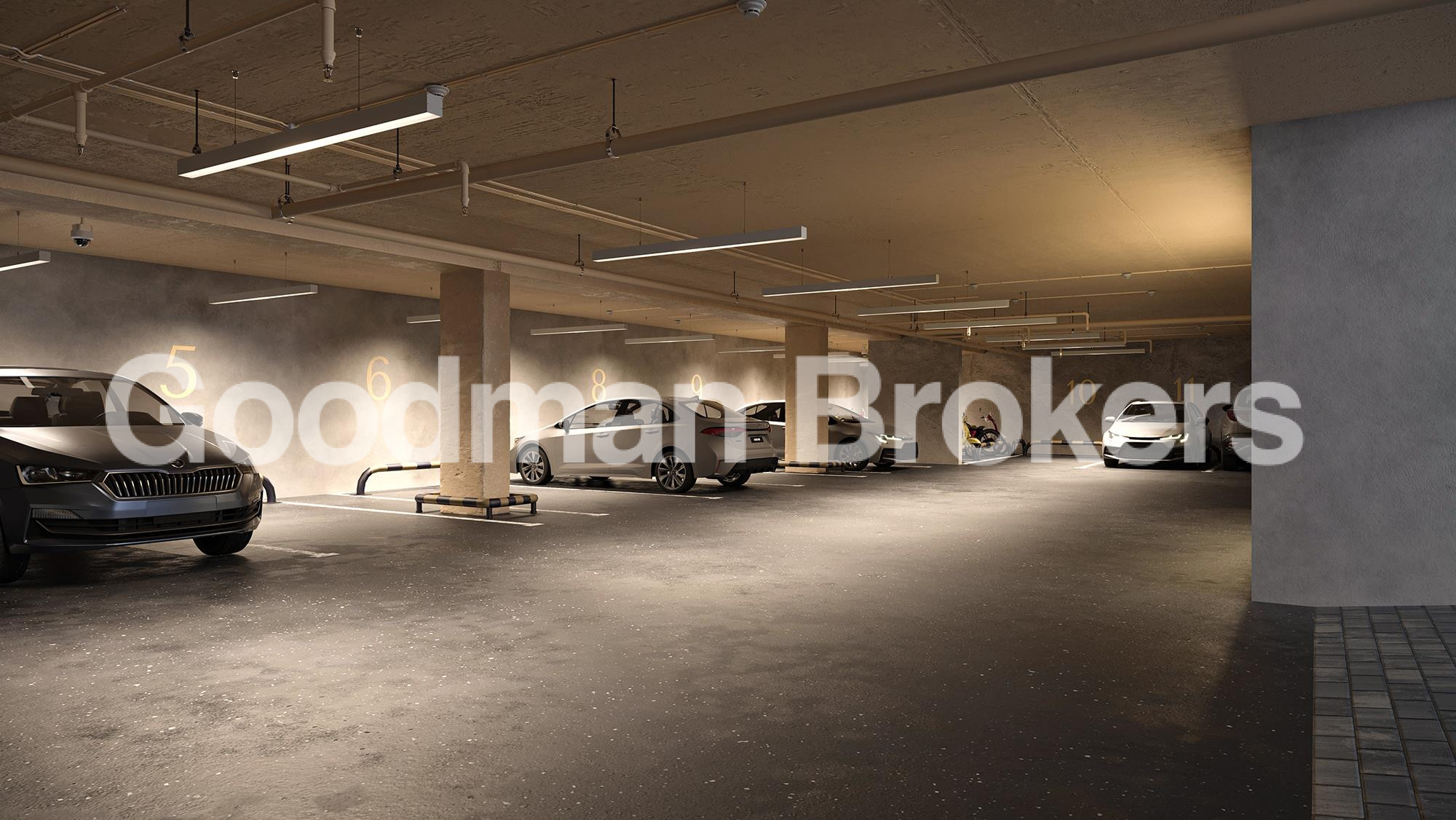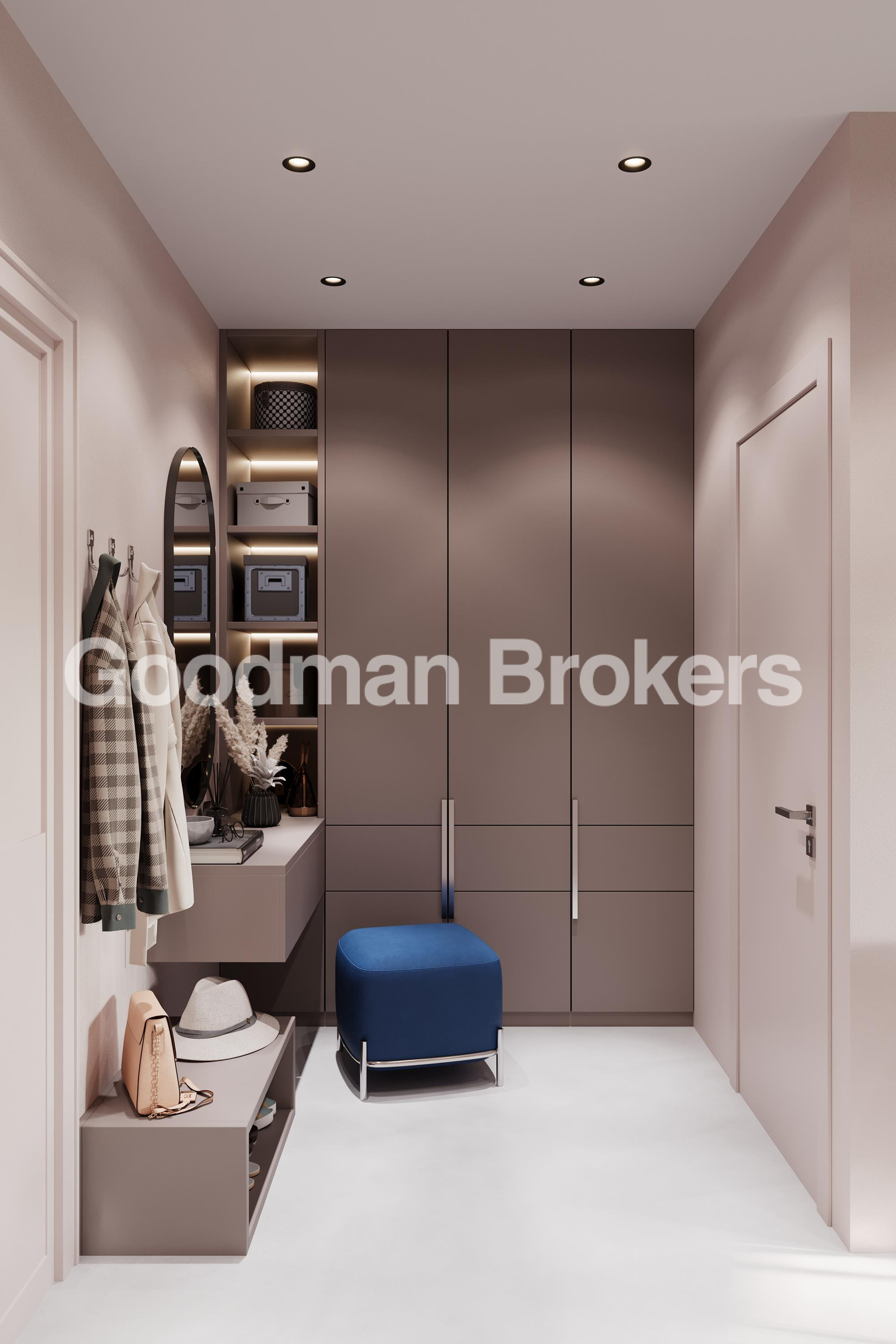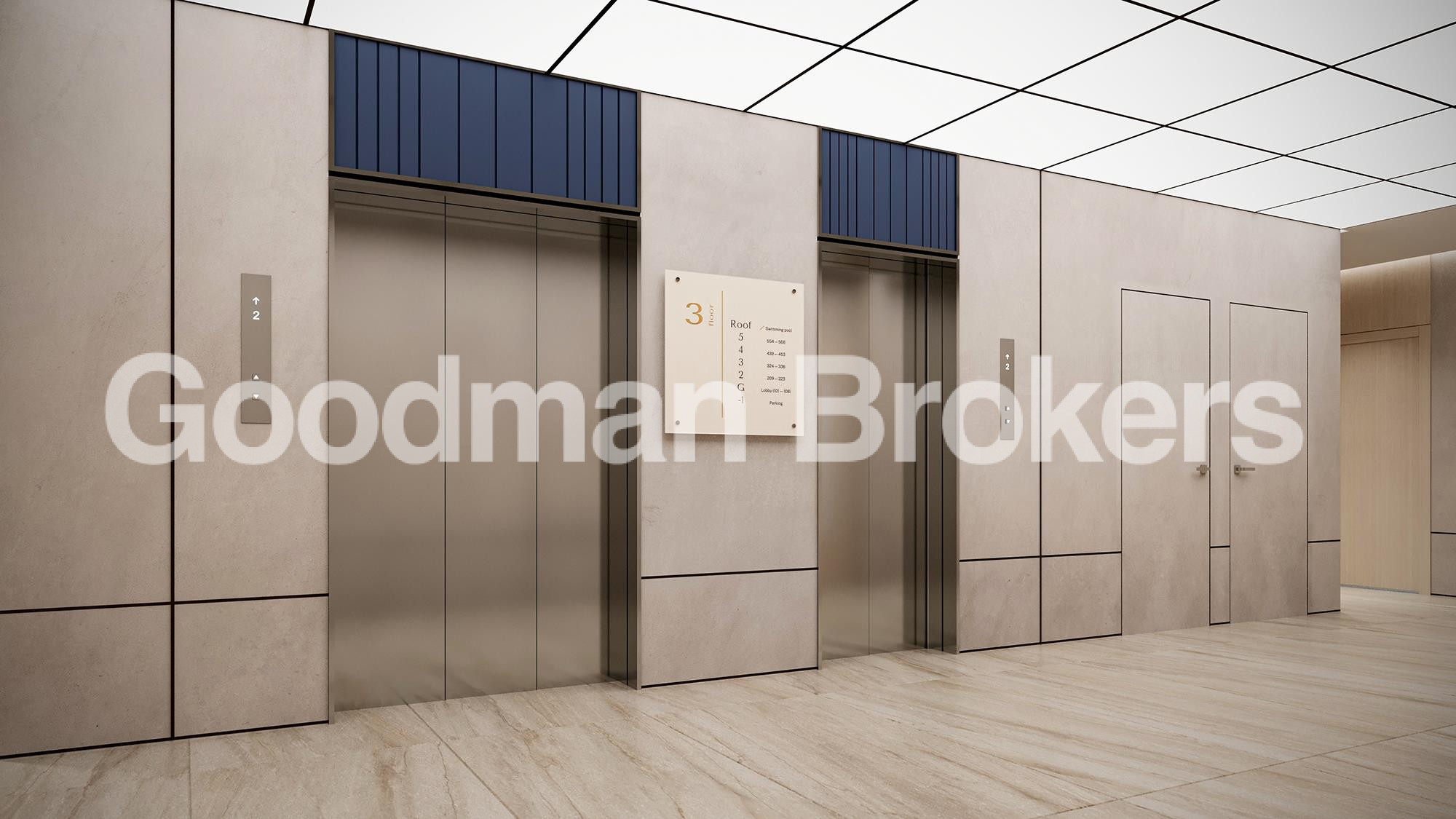 The architectural concept of the project emphasizes functionality, durability, and efficient use of space. The entrance lobby is executed in a modern style with extensive glazing, quality furnishings, and contemporary lighting elements that reinforce the overall status of the development.