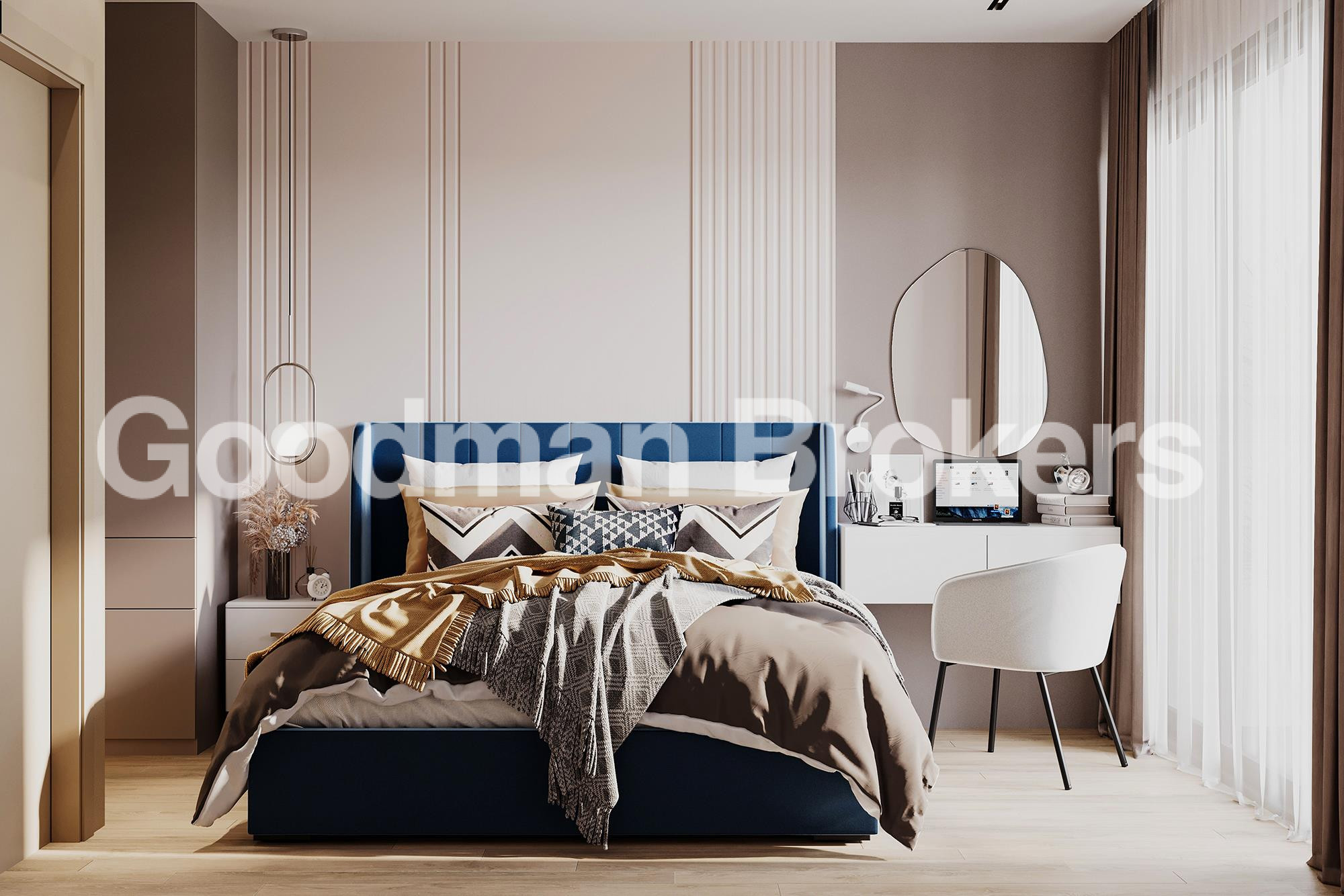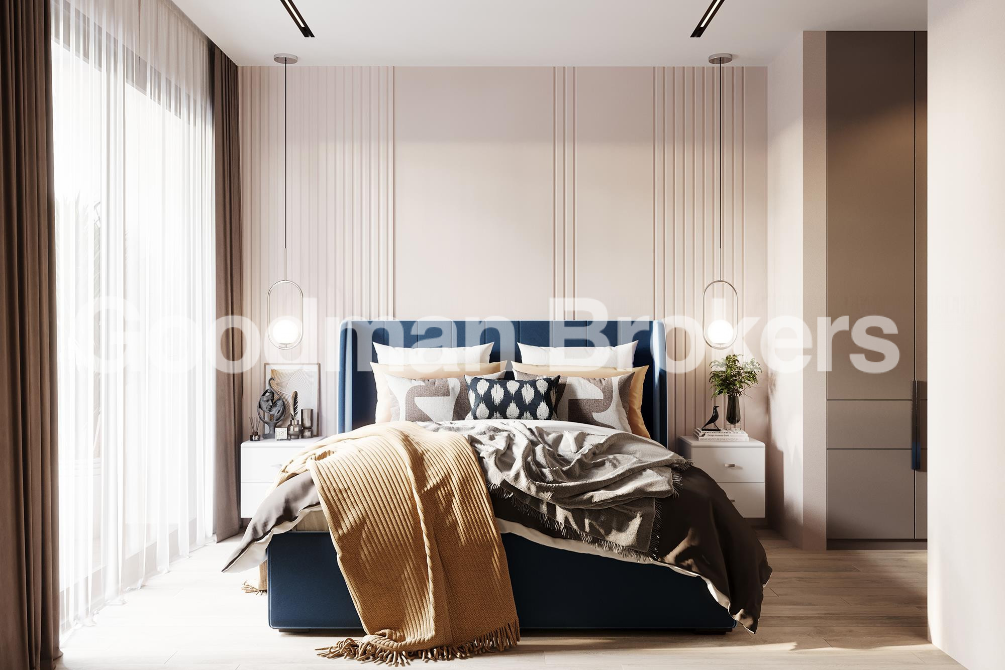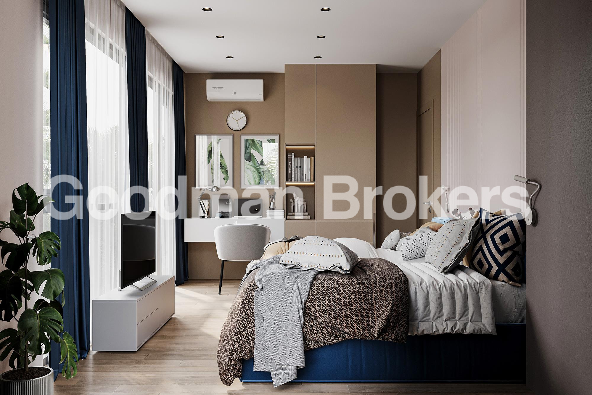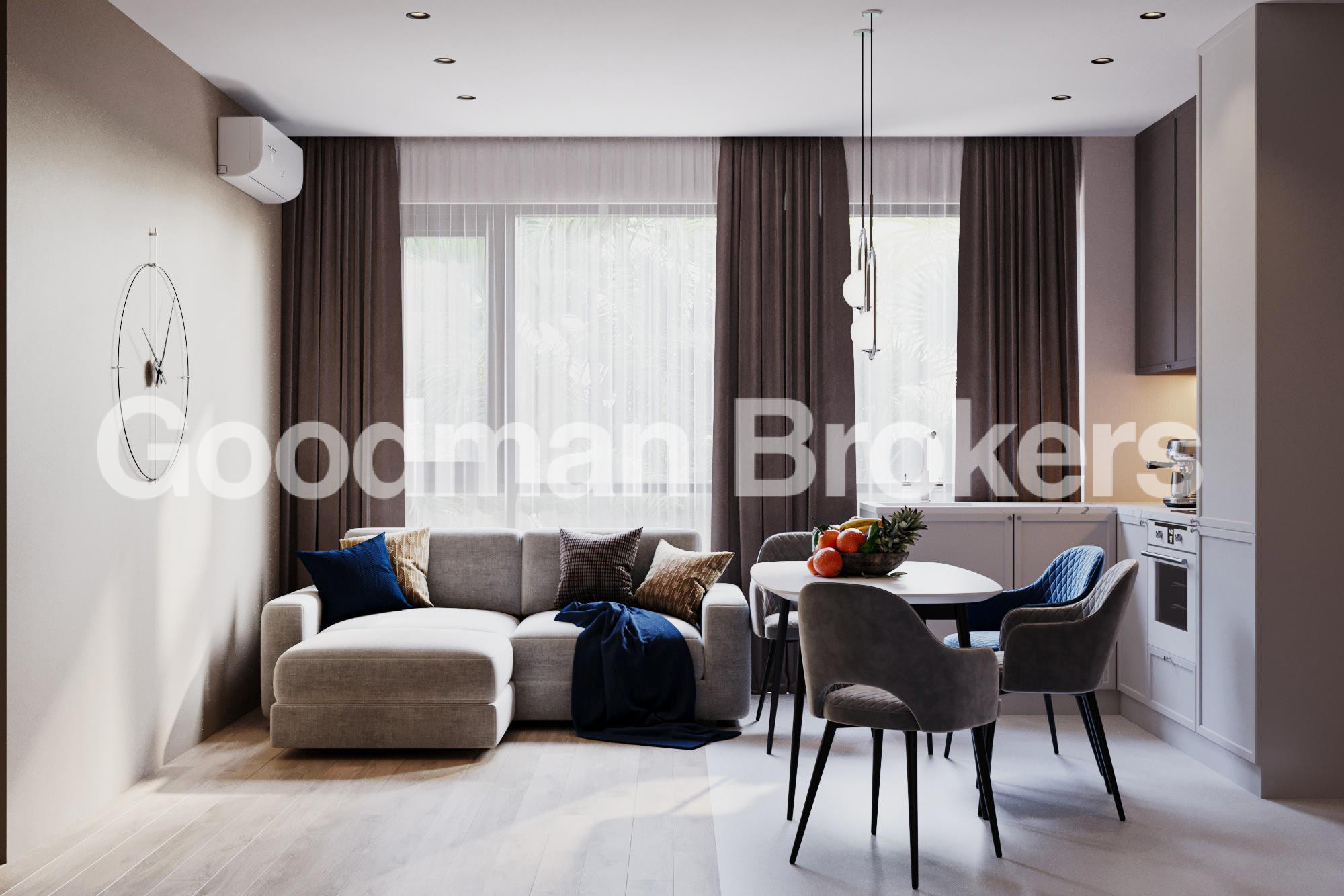 Two bedroom units start from 56 sq. m. and are designed with a clear separation between living and private areas. The layout includes a spacious living room with dining zone, a fully integrated kitchen area, two independent bedrooms, and well equipped bathrooms. Panoramic windows ensure sufficient natural light, while carefully selected finishing materials create a refined and cohesive interior environment.