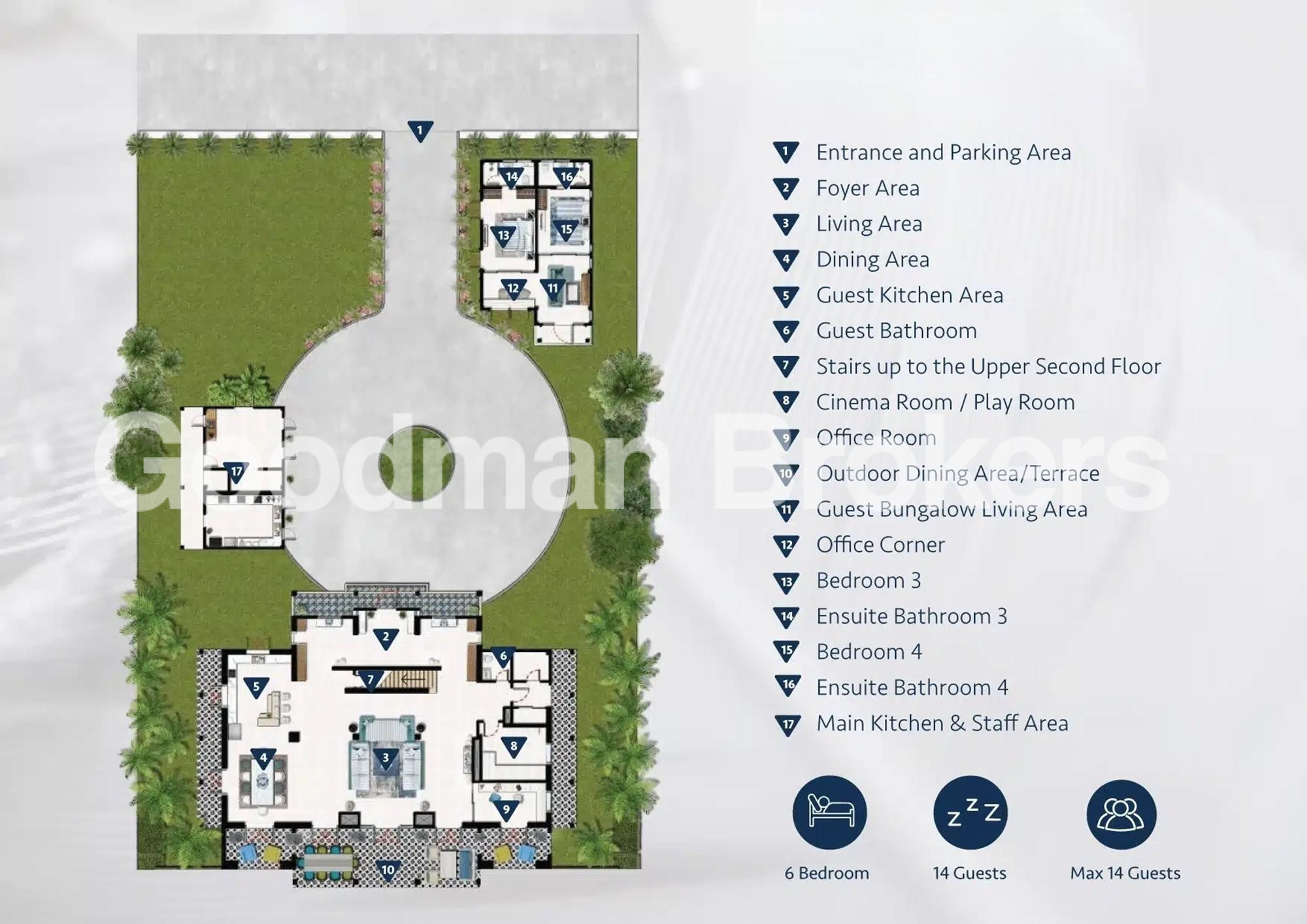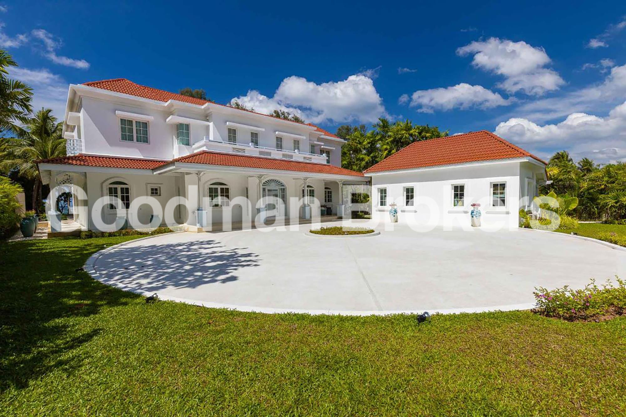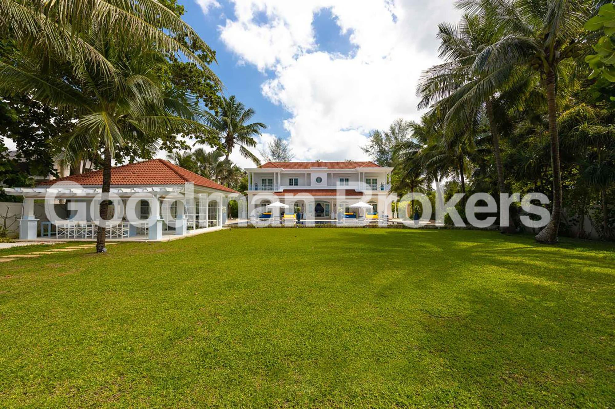 The estate extends across 2622 sqm with approximately 30 meters of direct beachfront frontage. A secure entrance with automated gates opens to a circular driveway designed to accommodate multiple vehicles, framed by landscaped tropical gardens that ensure discretion and a strong sense of arrival.