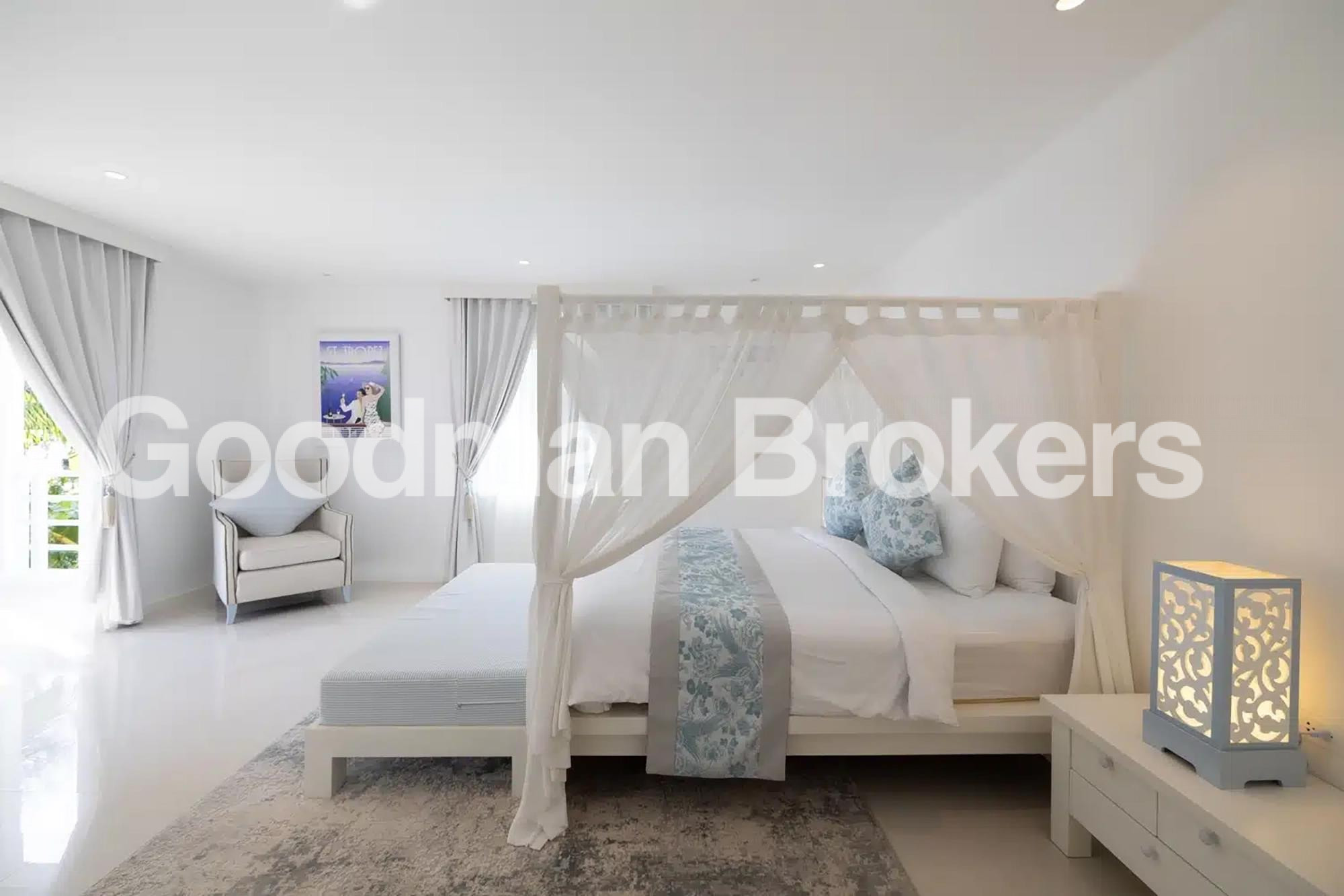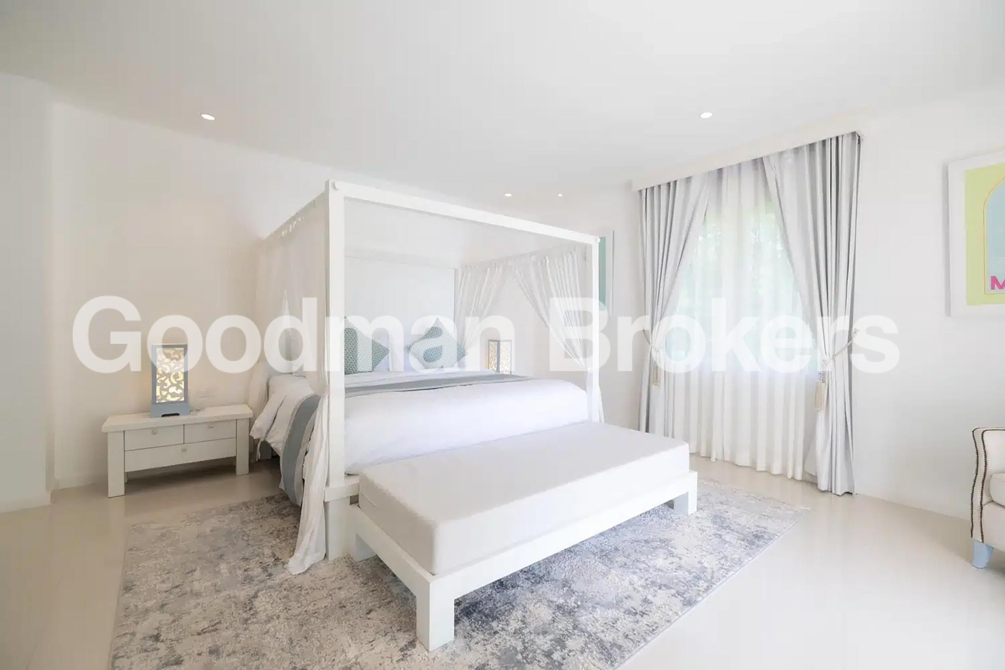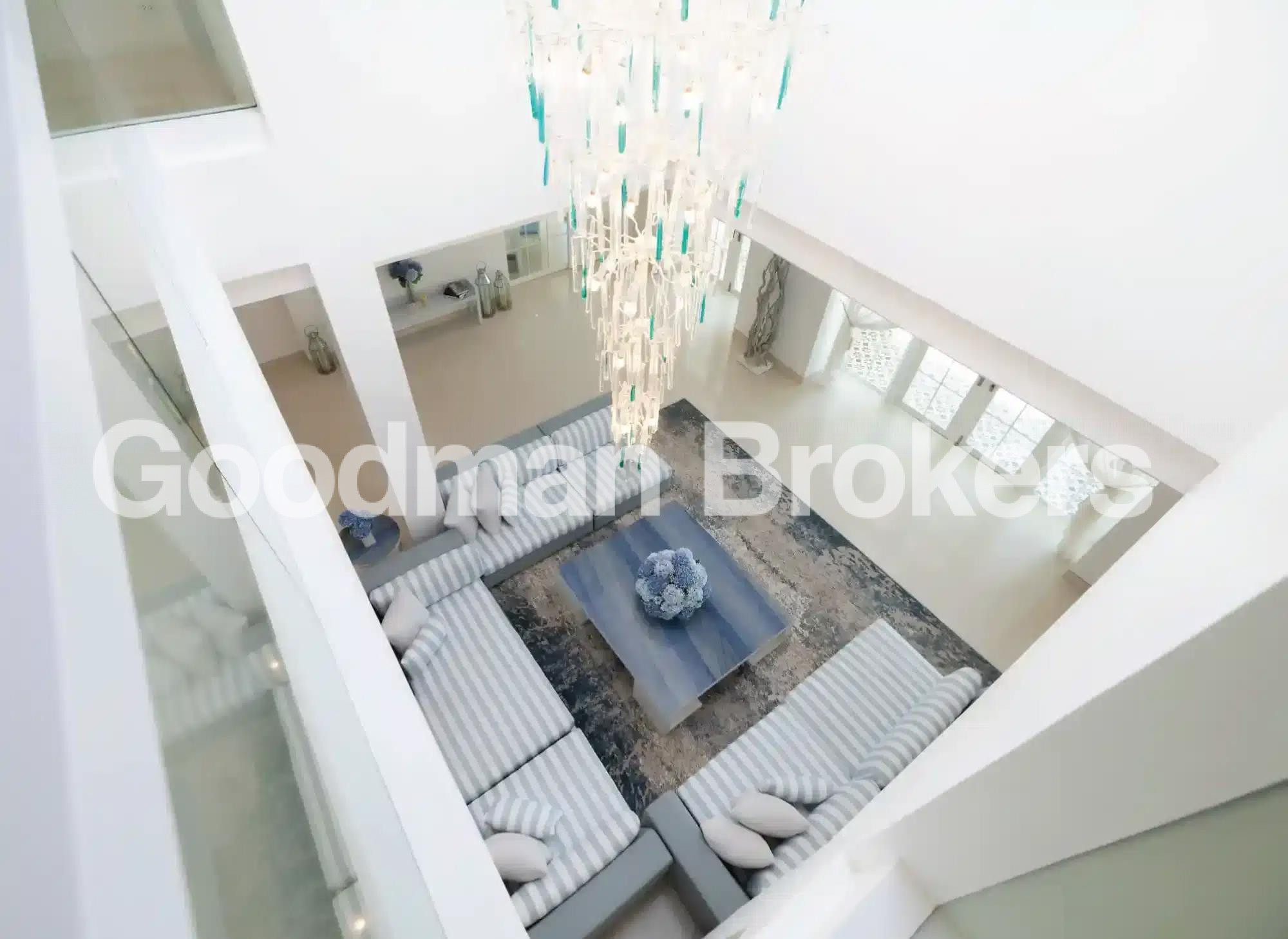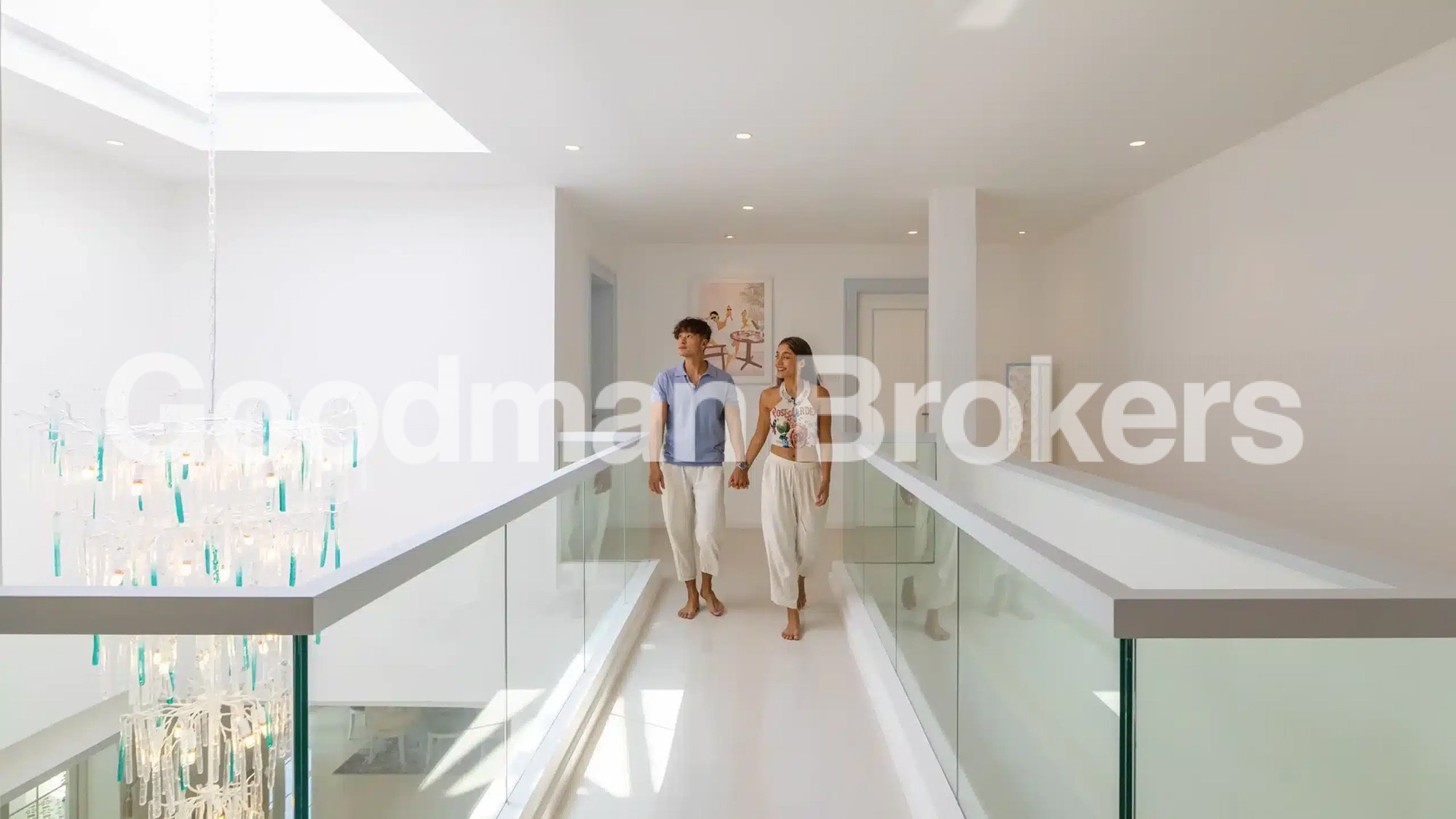 The villa comprises 6 bedrooms and 8 bathrooms. Four principal suites are arranged within a dedicated wing. Two master bedrooms offer walk in wardrobes, large ensuite bathrooms with bath, shower and double vanities, along with private terraces overlooking the pool and sea. One master suite includes a jacuzzi bath. The remaining suites feature ensuite bathrooms, walk in wardrobes and balconies with ocean views.
