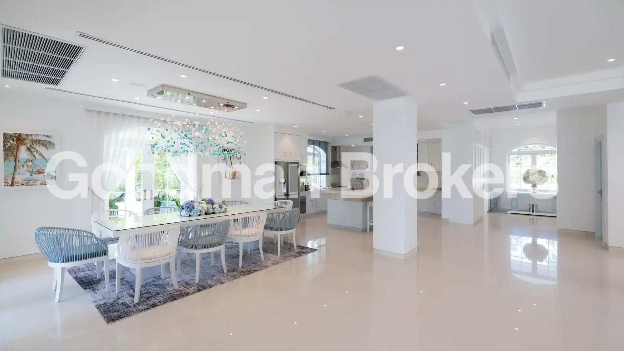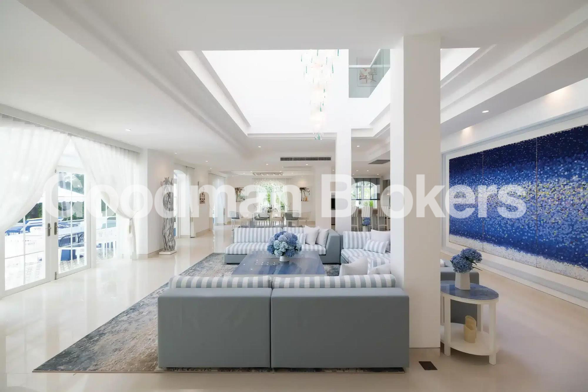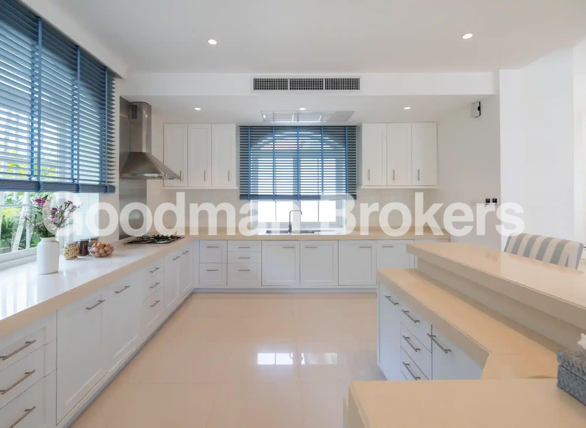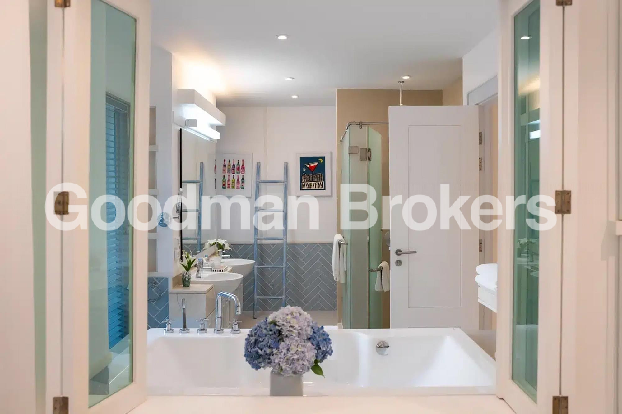 The villa comprises 6 bedrooms and 8 bathrooms. Four principal suites are arranged within a dedicated wing. Two master bedrooms offer walk in wardrobes, large ensuite bathrooms with bath, shower and double vanities, along with private terraces overlooking the pool and sea. One master suite includes a jacuzzi bath. The remaining suites feature ensuite bathrooms, walk in wardrobes and balconies with ocean views.