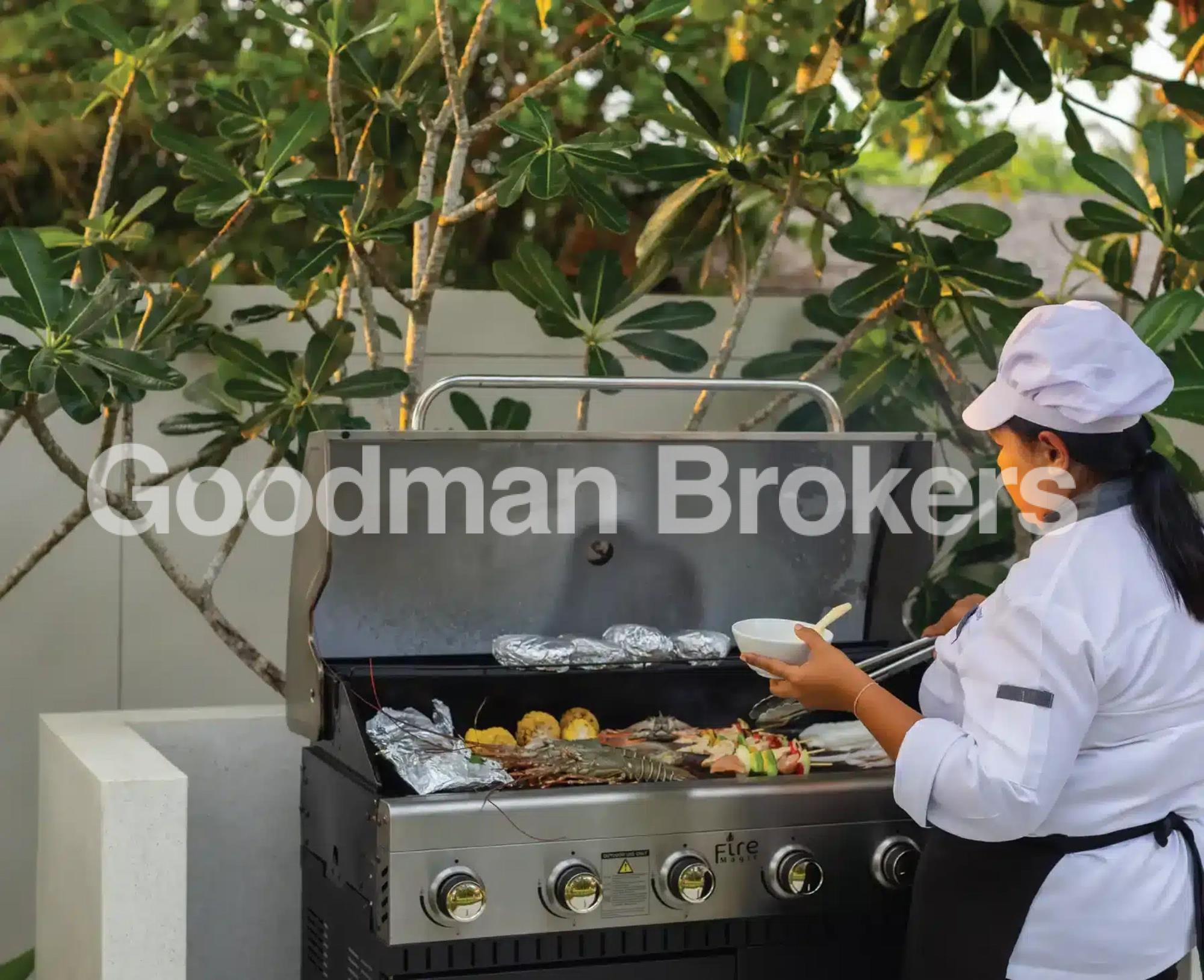 A dedicated BBQ kitchen and outdoor dining area are positioned close to the beach, allowing for direct access and functional use of the outdoor environment.