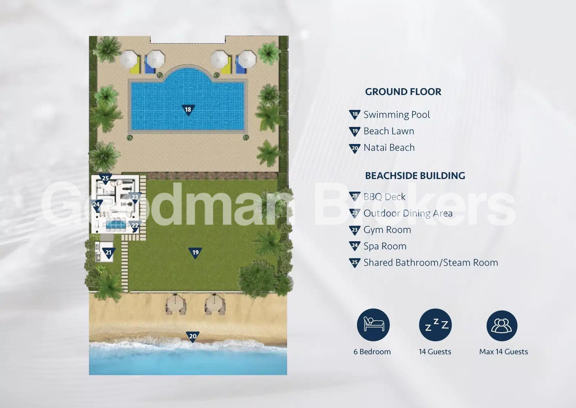 Positioned along the exclusive coastline of Natai Beach, this luxury beachfront villa for sale offers a rare combination of privacy, scale and direct access to one of Thailand’s most sought after stretches of shoreline. The property is set within a quiet residential enclave, surrounded by high end beachfront estates and protected from through traffic.