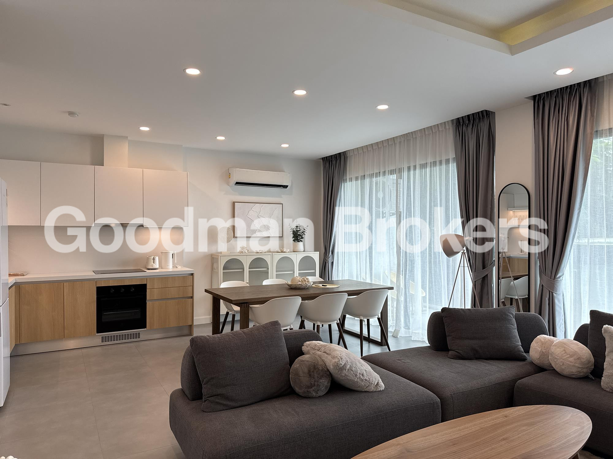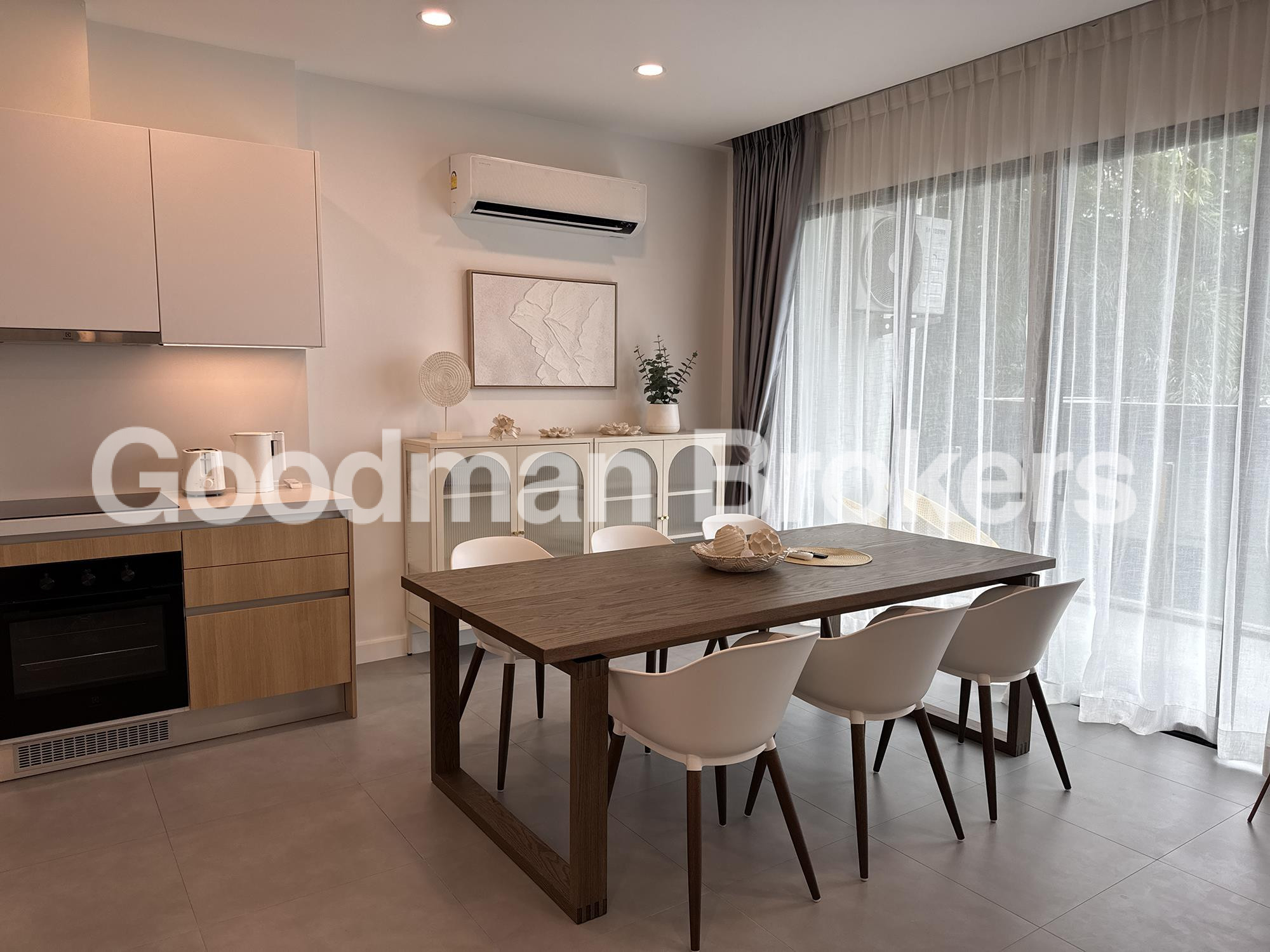 The layout spans 3 floors, offering a clear separation between private quarters and entertaining spaces. The entry level houses the main living and dining area, which opens onto a covered terrace overlooking the communal pool and the Andaman Sea. The kitchen is fitted with European appliances and ample storage, suitable for both everyday use and formal entertaining. Two guest bedrooms with ensuite bathrooms occupy the same level, each with direct access to outdoor space.